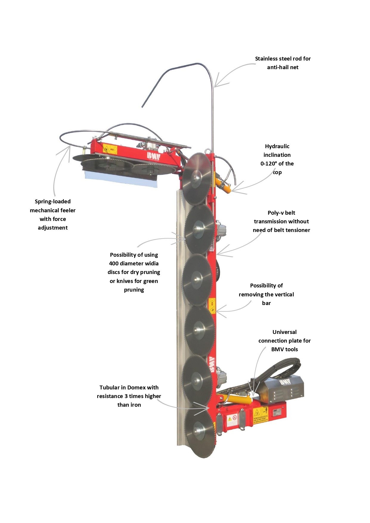 The new BMV pruner type "FL250P" for green and dry trees allows cutting under anti-hail net and is equipped with a device with mechanical feeler that allows retraction near the row posts. For dry pruning, Ø 400 rotating discs are mounted for orchard branches up to 6-7 cm in diameter. For green pruning, quickly and easily, knives are mounted. The 4 hydraulic movements for RISE, INCLINATION, LATERAL MOVEMENT, TOP INCLINATION, allow the machine to best adapt to the row. Assembly and disassembly are quick and simple on any type of tractor.