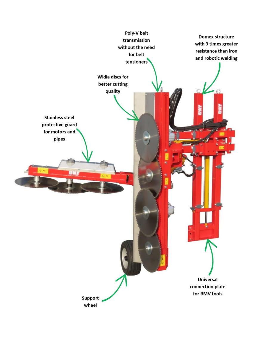 The new BMV green and dry pruner type "FL800PMT" was designed to carry out the pruning of blueberry plants. Rotating discs Ø 500 in diameter are mounted.