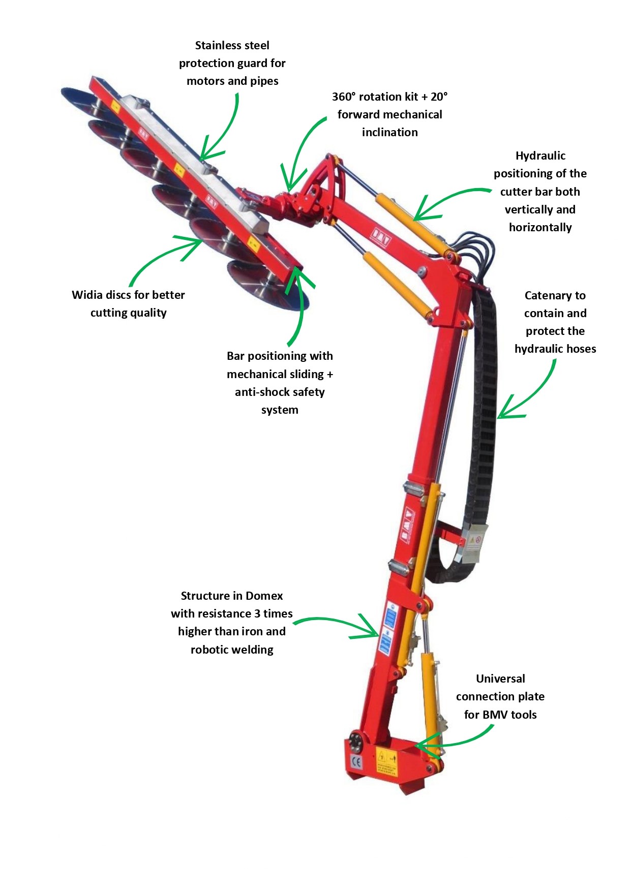 The BMV pruner model “FLHD900” can perform both green and dry pruning of citrus groves, olive groves, orchards and hazelnut groves. For green pruning, knives are used, fur cutting branches up to 2-3 cm in diameter. For dry pruning, discs with widia teeth Ø 500 or Ø 600 are used, for branches up to 15 cm in diameter.